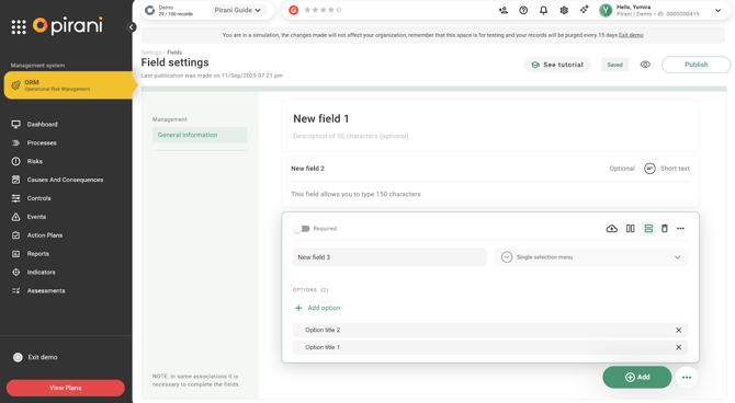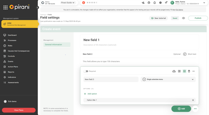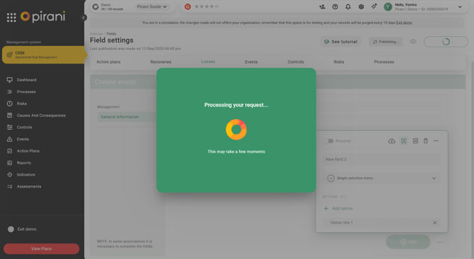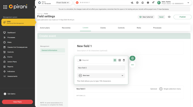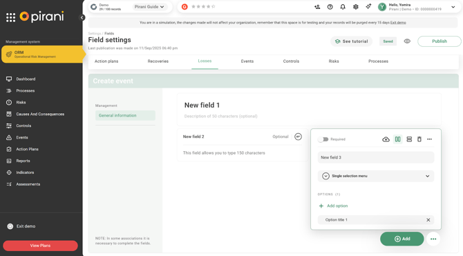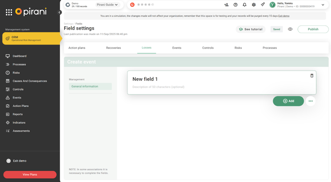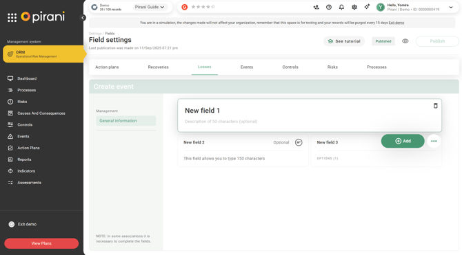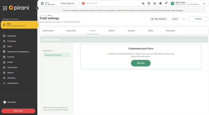 Now in Pirani, you can customize the forms associated with losses and recoveries within the events registered in the system, thanks to the dynamic fields functionality. This enhancement allows organizations to tailor the forms to their specific needs or event types by incorporating the fields deemed relevant for the analysis and traceability of information.