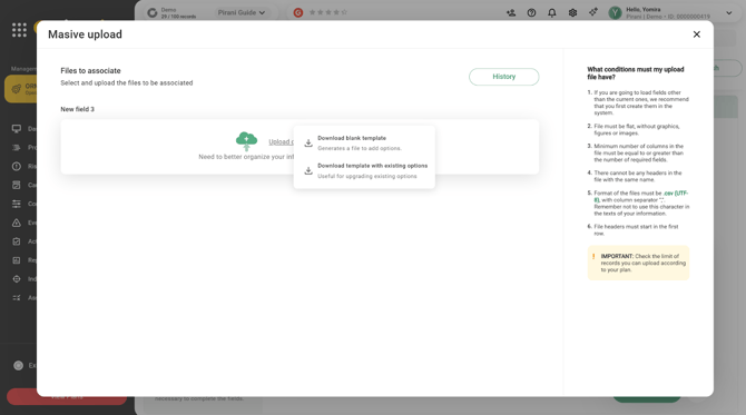 Download template with existing options: This template is used for hierarchical fields. It will be downloaded with identifiers that will help link the hierarchical field options.