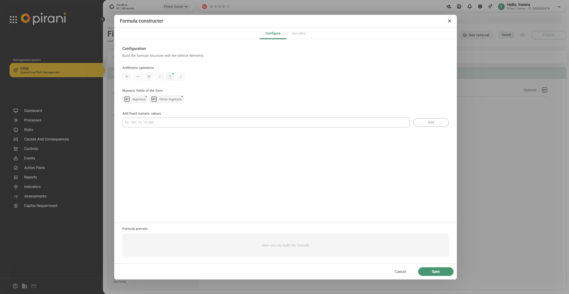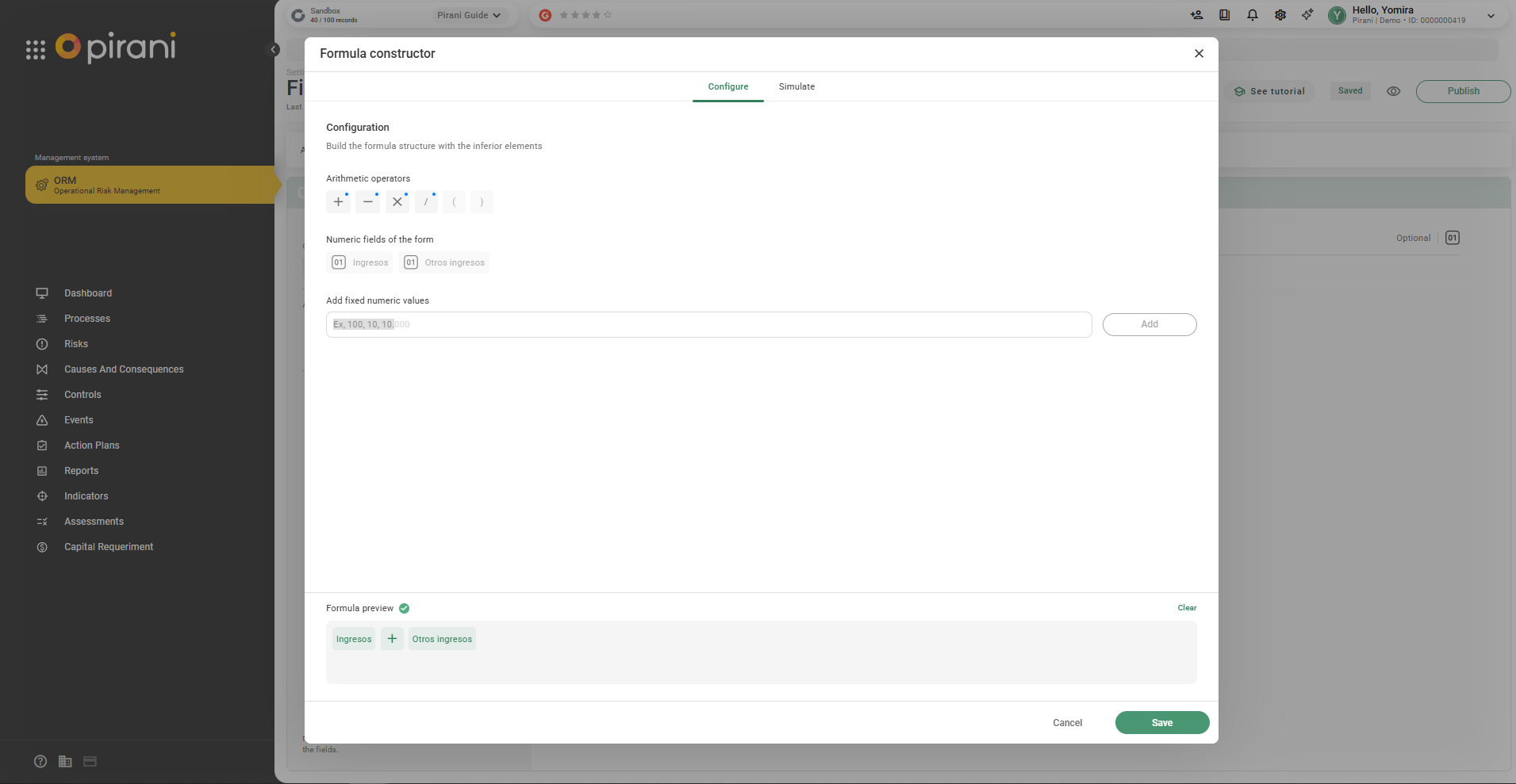 Step 3: The system will display the available operators and the numeric fields in the form.