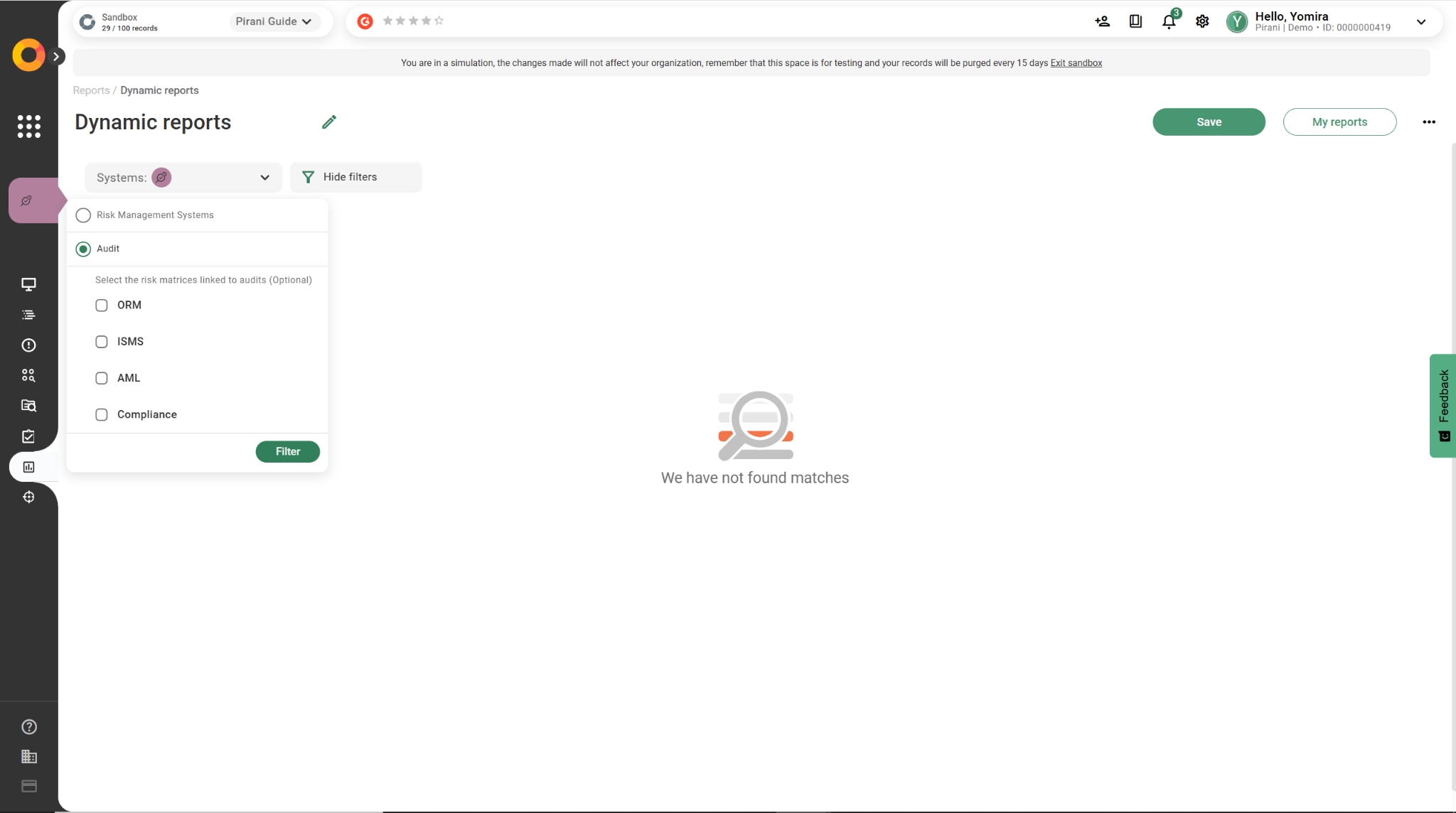 ⚙️ In the case of “Audits”, the filter will appear differently: you’ll be able to select the risk matrices linked to the audit (this selection is optional).