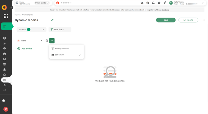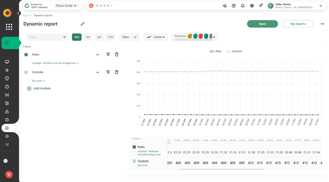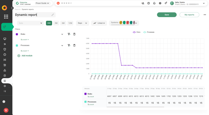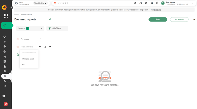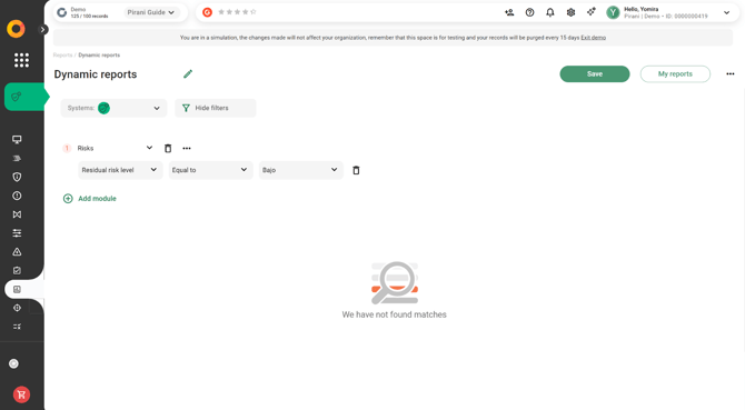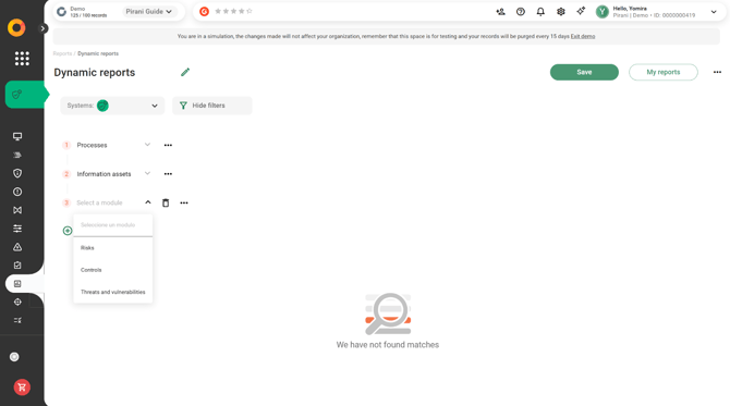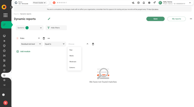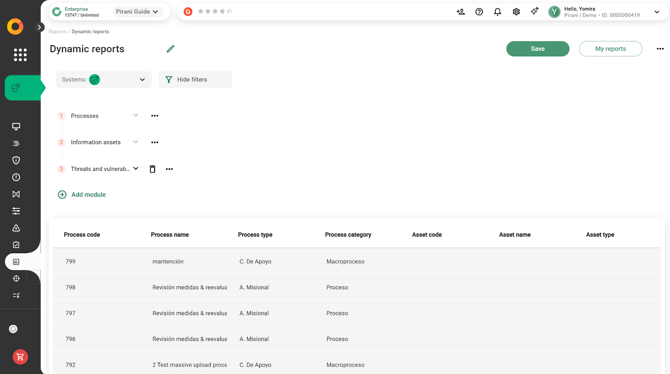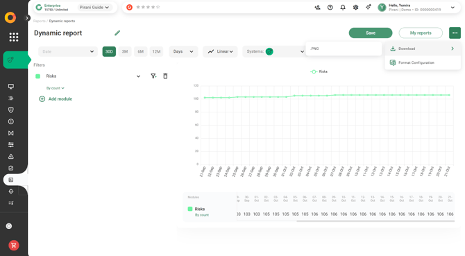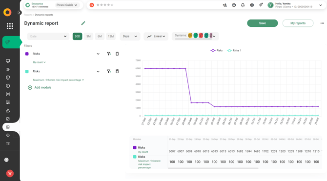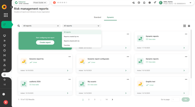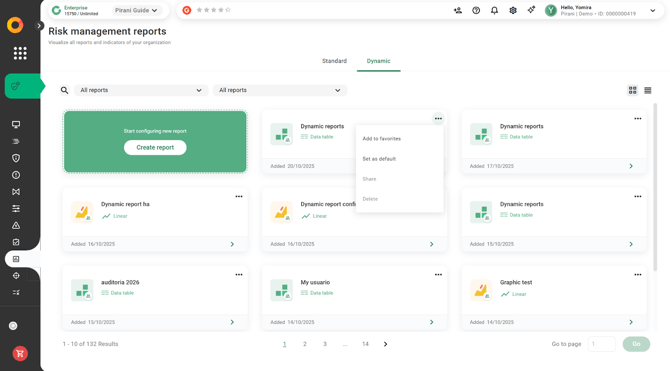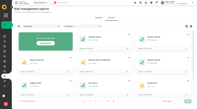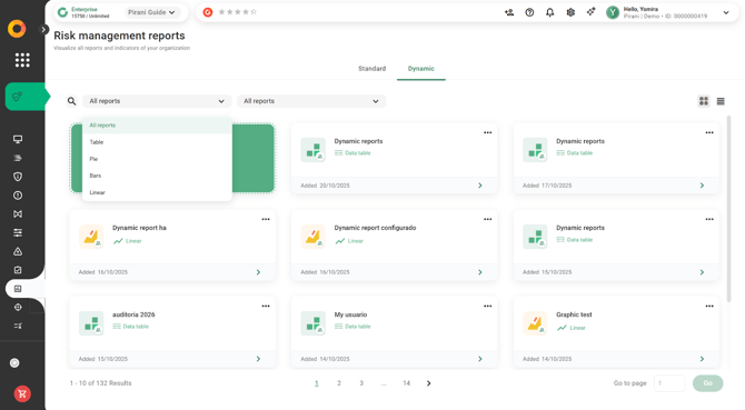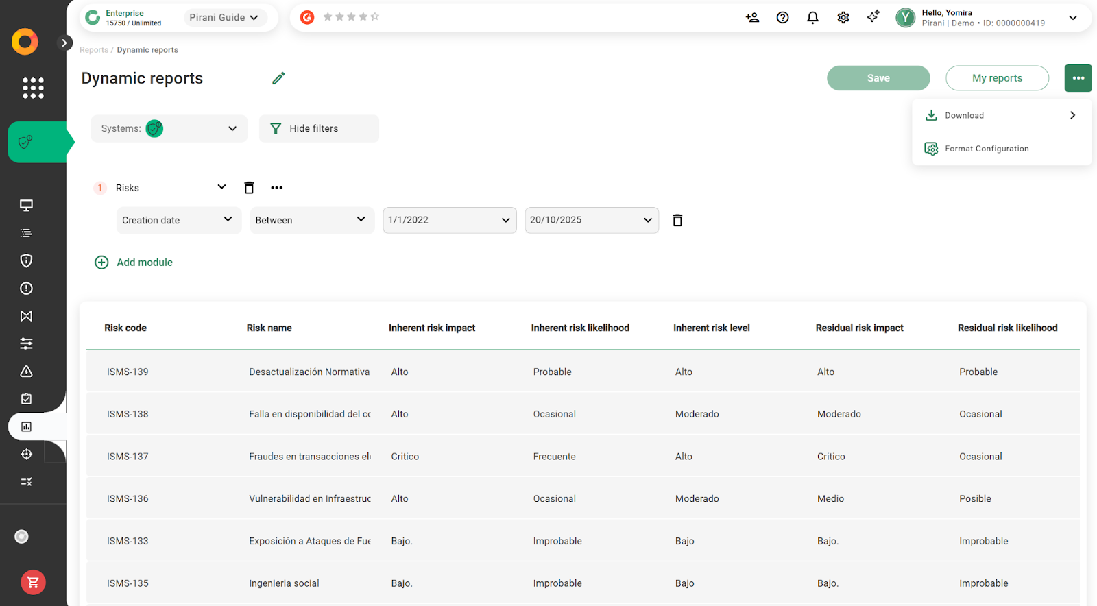 With Pirani, you can use the Dynamic Reports module to build reports related to your organization's risk management, applying specific filters and downloading them instantly in formats such as .xls or .png.