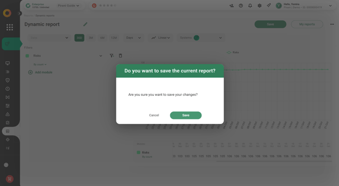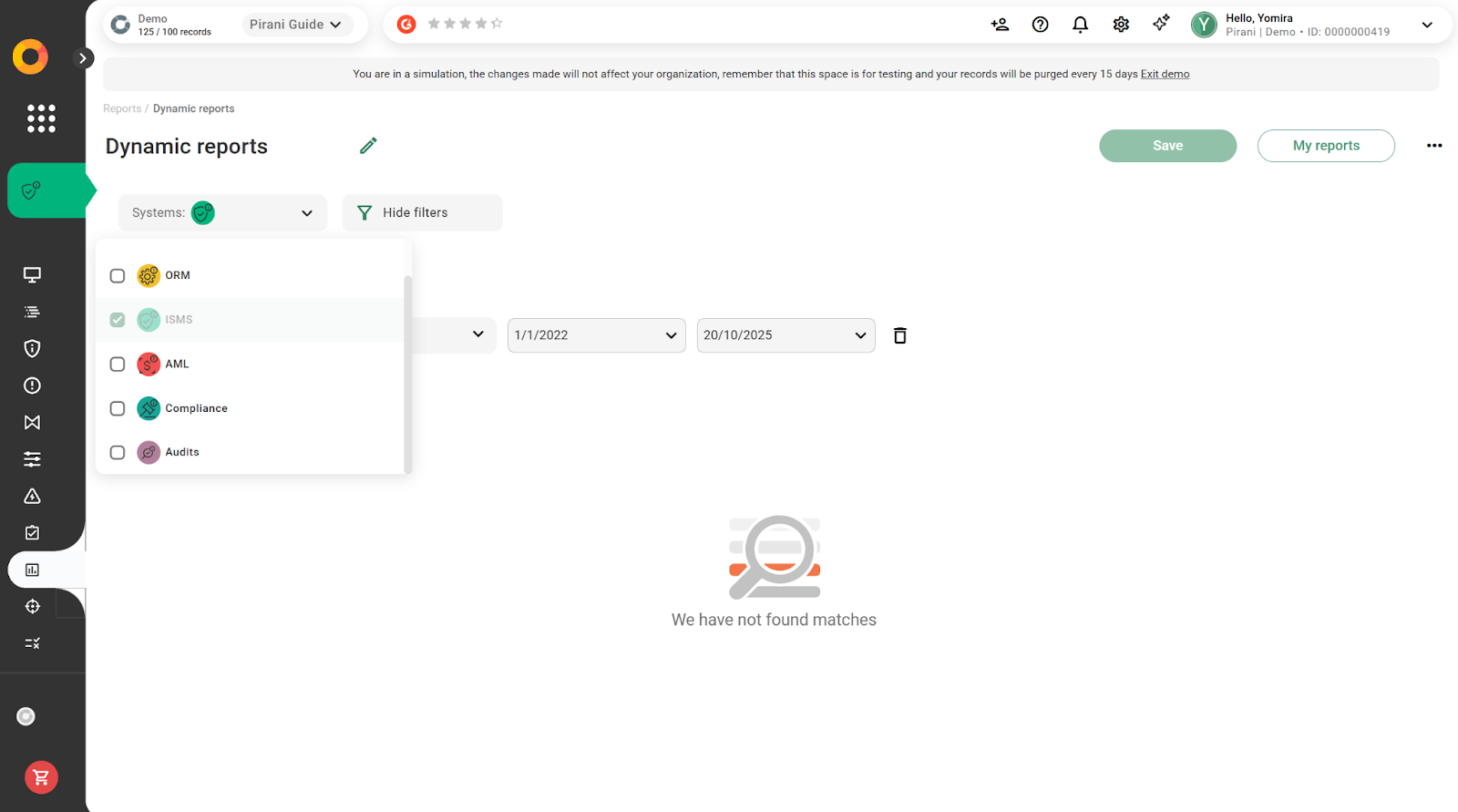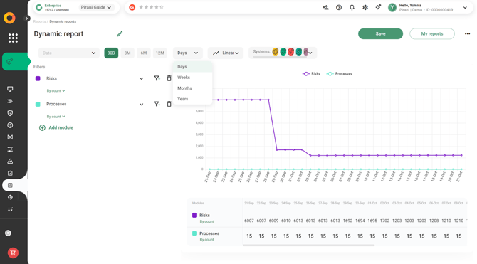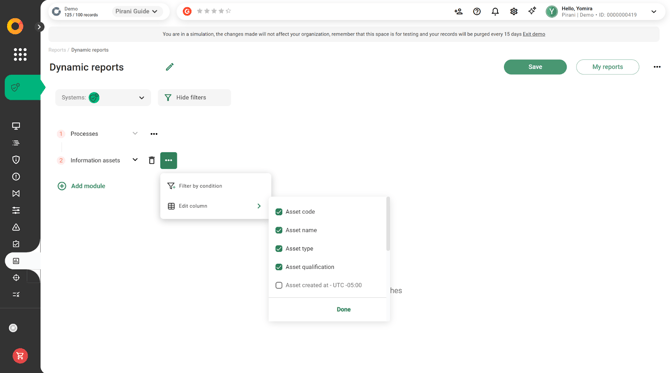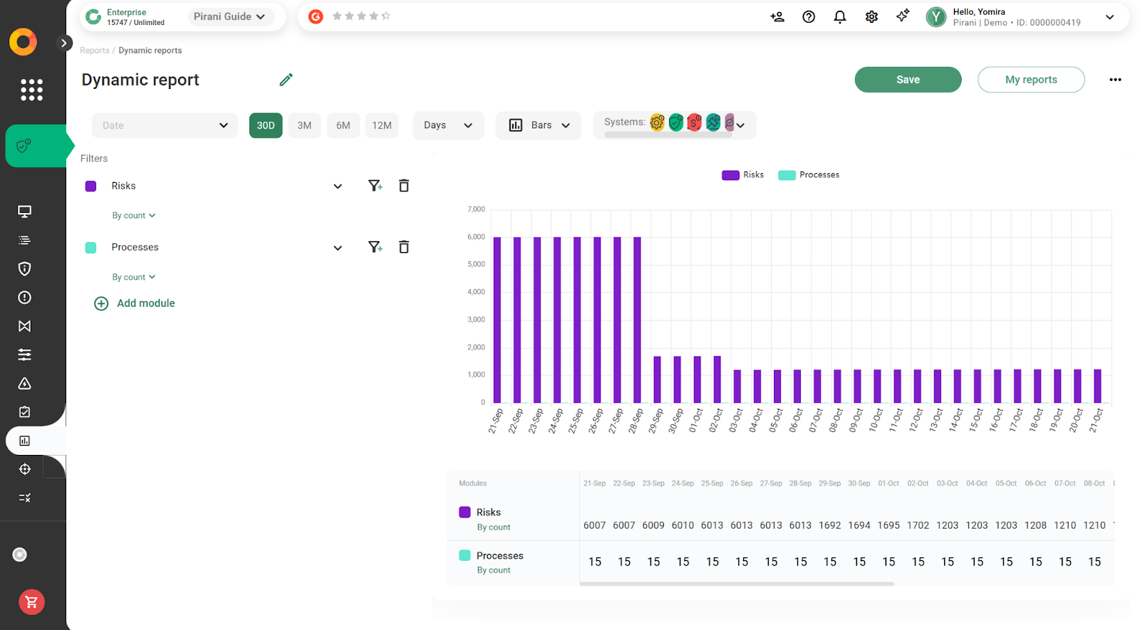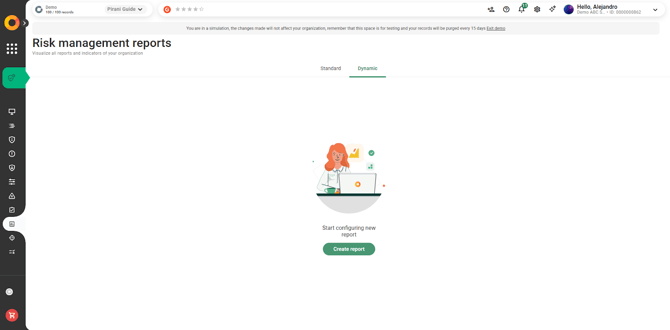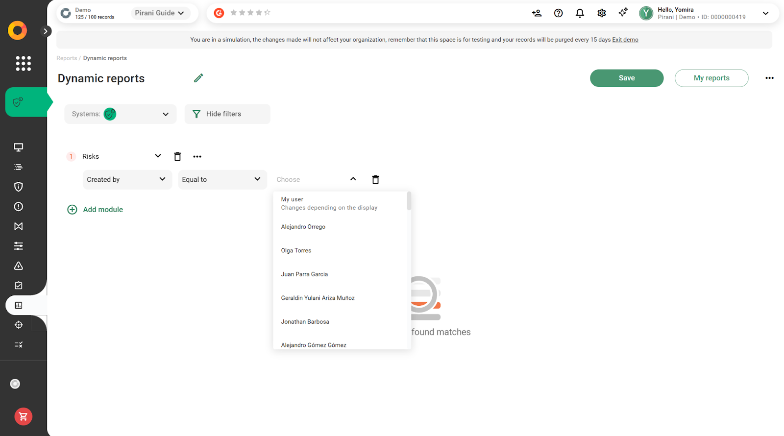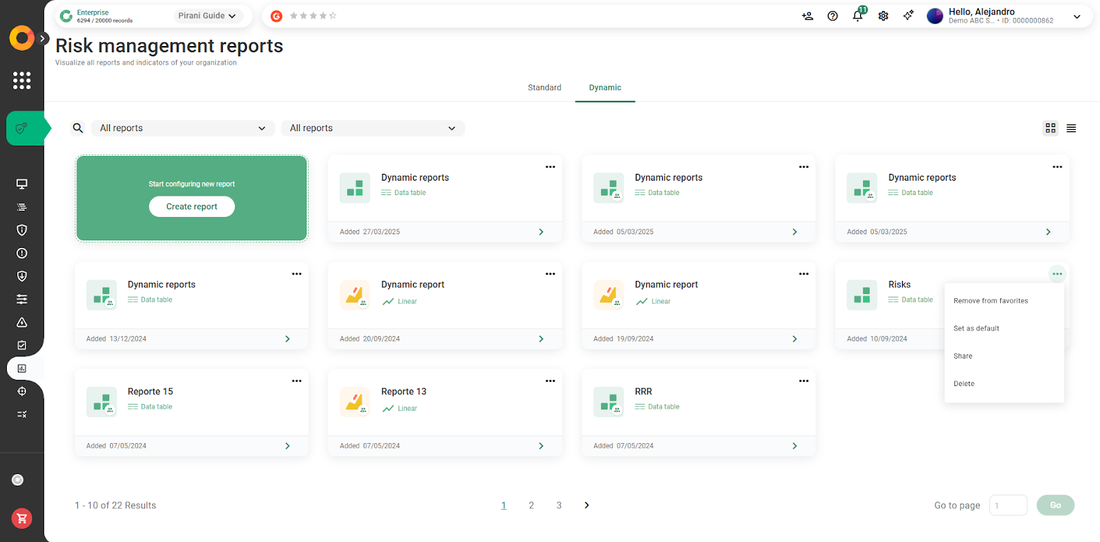 With Pirani, you can use the Dynamic Reports module to build reports related to your organization's risk management, applying specific filters and downloading them instantly in formats such as .xls or .png.