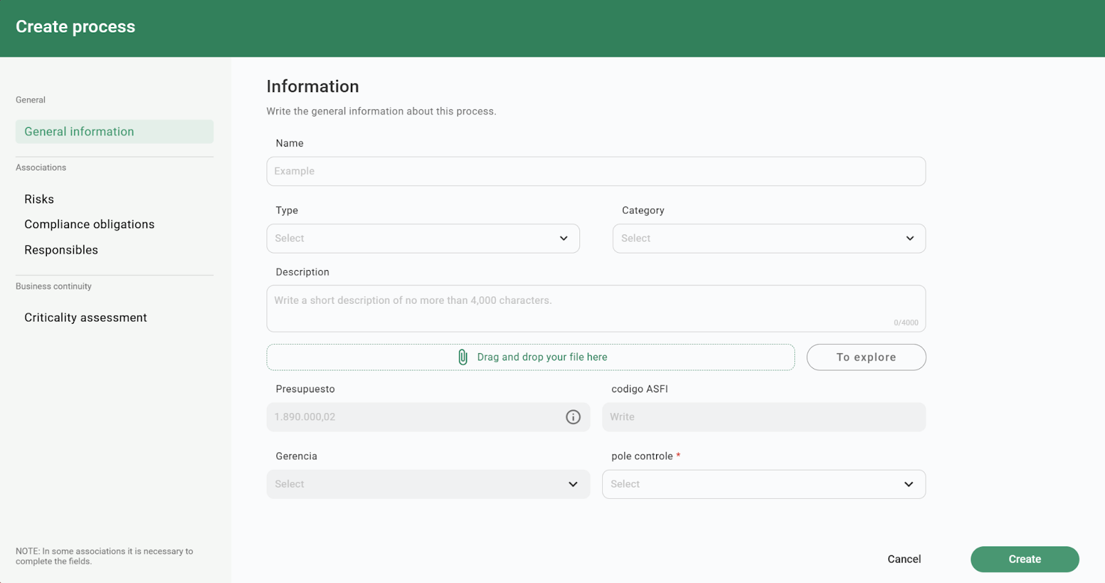 If you choose to filter Processes by Information Assets, the associations that this module has will appear, that is: Threat and Vulnerability and Risks.