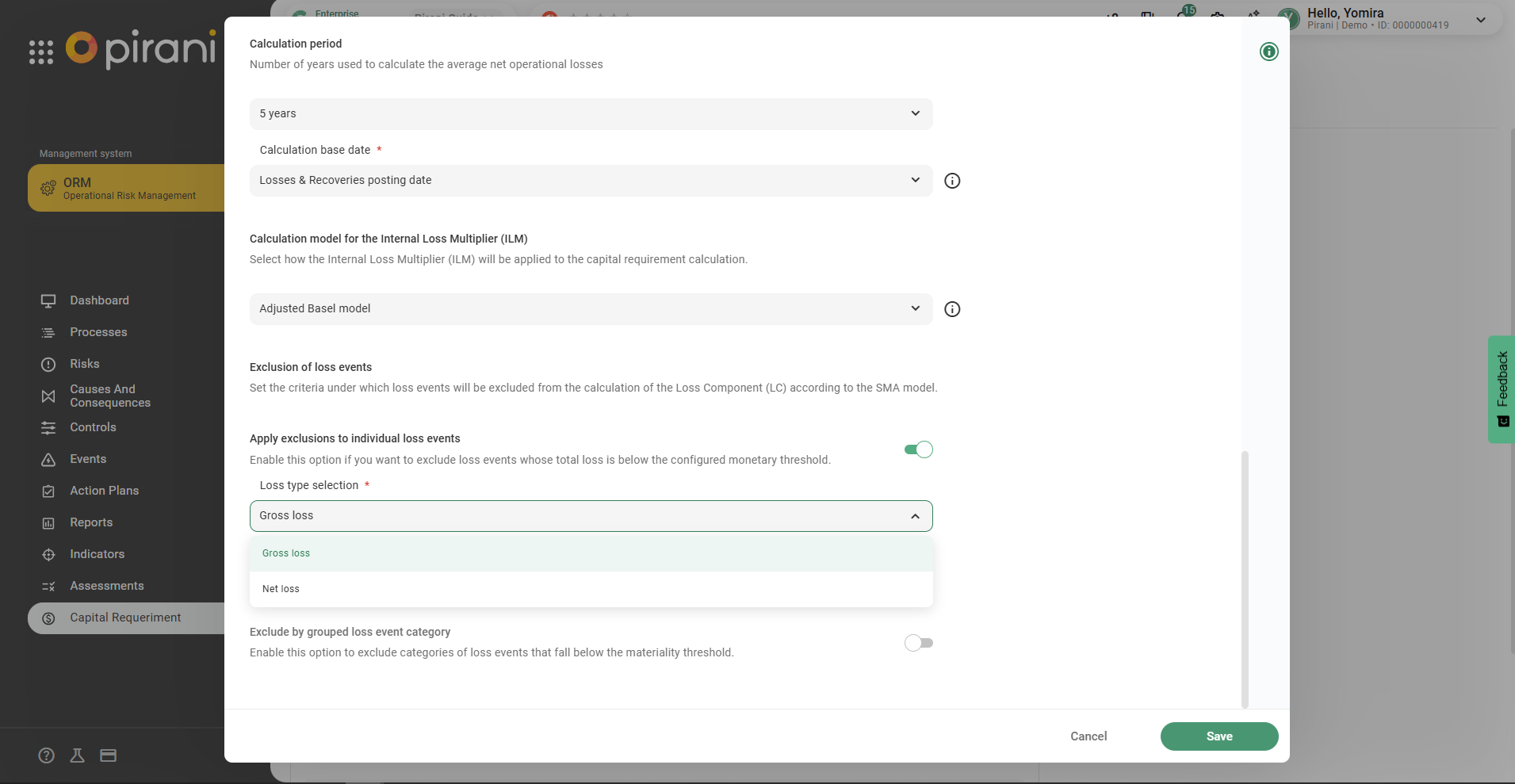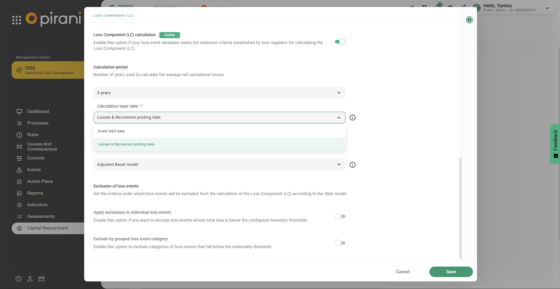 Under SMA, the LC component can be calculated applying operational event exclusion rules as allowed by local regulations. Pirani allows configuration of two exclusion mechanisms: