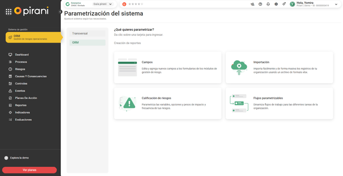 Los campos dinámicos se encuentran en el módulo de parametrización , ícono de engranaje, ORM,Compliance y ISMS, ingresamos a “Campos”.