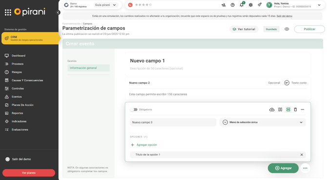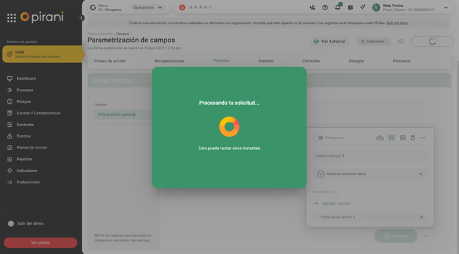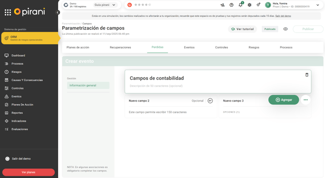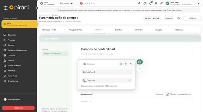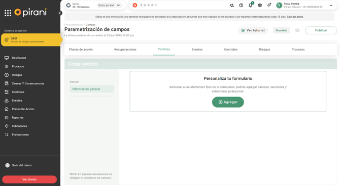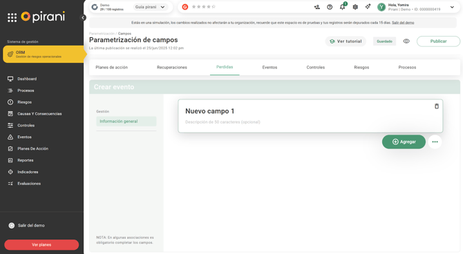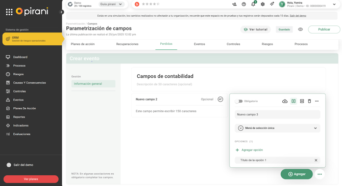 Ahora en Pirani, podrás personalizar los formularios asociados a pérdidas y recuperaciones dentro de los eventos registrados en el sistema, gracias a la funcionalidad de campos dinámicos. Esta mejora permite adaptar los formularios a las necesidades específicas de cada organización o tipo de evento, incorporando los campos que se consideren relevantes para el análisis y la trazabilidad de la información.
