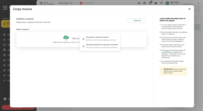 Carga masiva: para los campos de selección única y múltiple, podrás agregar masivamente las opciones para elegir. Esta opción te mostrará dos plantillas de sugerencias: