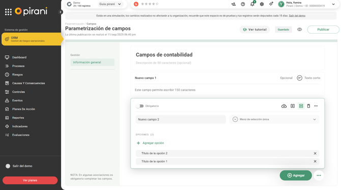 Para eliminar el campo, deberás hacer clic en el bote de basura. Cuando elimines un campo, se eliminará también toda la información asociada a ese campo en tus registros de riesgos, procesos, controles, eventos, pérdidas, recuperaciones y planes de acción.