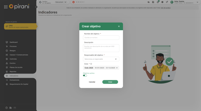 Para crear un objetivo dirígete al lado izquierdo de la herramienta, selecciona el módulo de Indicadores y dale clic al botón de “Crear objetivo”, acá deberás de llenar los siguientes datos: