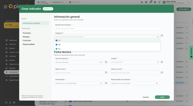 Categoría de indicador: selecciona la categoría del indicador entre KCI, KRI y KPI
