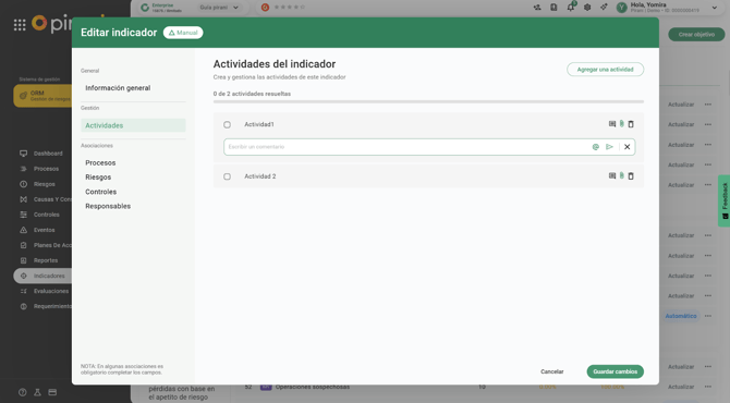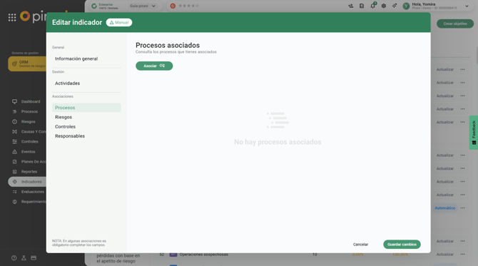 Podrás asociar procesos, riesgos, controles y/o responsables según el indicador que estés creando.