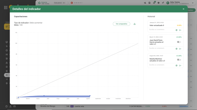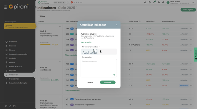 Al lado derecho de cada indicador encontrarás el botón de “Actualizar”, acá podrás cambiar el valor actual que tiene el indicador y agregar un comentario para detallar información sobre este cambio.