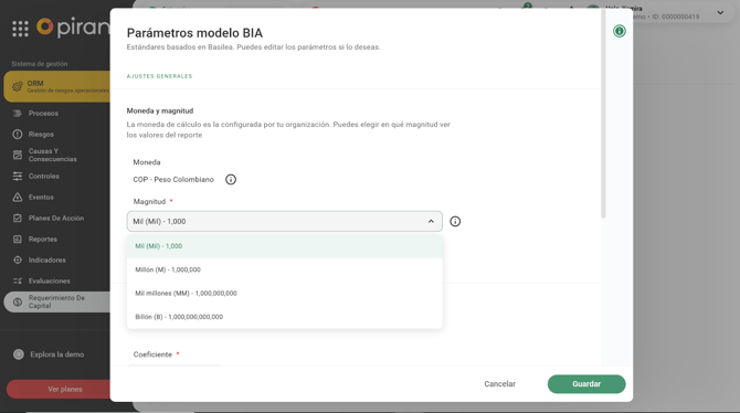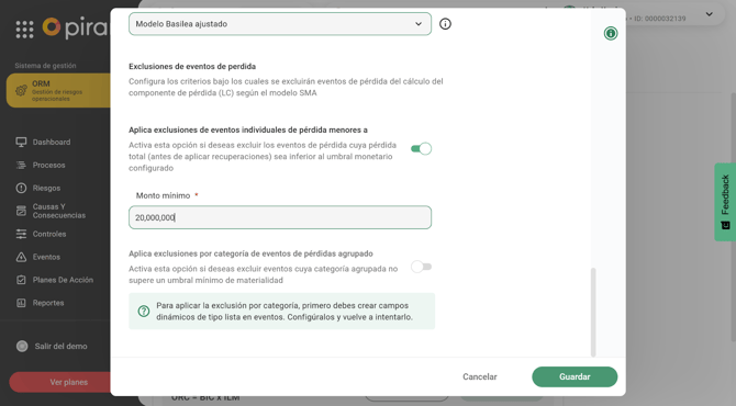 Esta funcionalidad permite excluir automáticamente los eventos individuales de pérdida operacional cuyo valor esté por debajo de un umbral mínimo de materialidad.