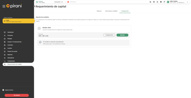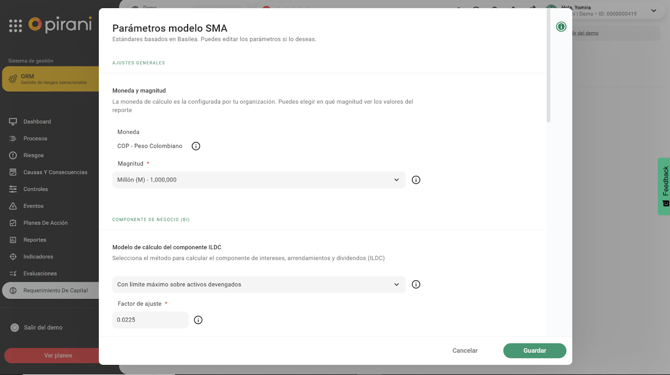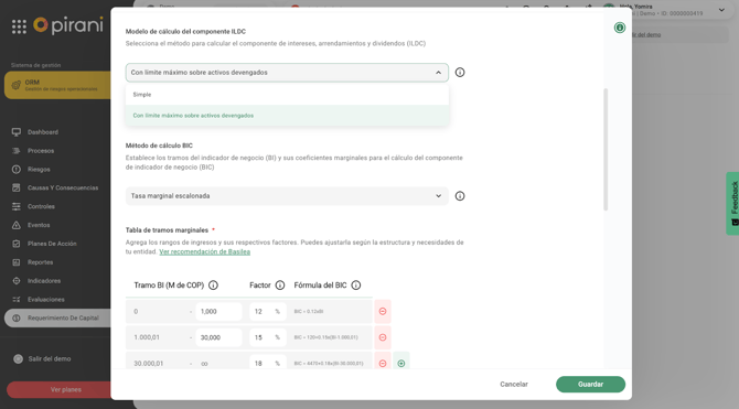 Cuando ingreses a “Requerimiento de capital” en la pestaña de “Configuración”, configura el modelo o los modelos que vas a usar.