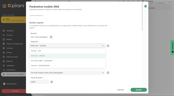 En la opción de método “Con límite máximo sobre activos devengados”, se requiere un parámetro adicional que es el factor de ajuste. En dónde el usuario puede ajustarlo, viene por defecto el valor de 0.0225 que Basilea IV recomienda.