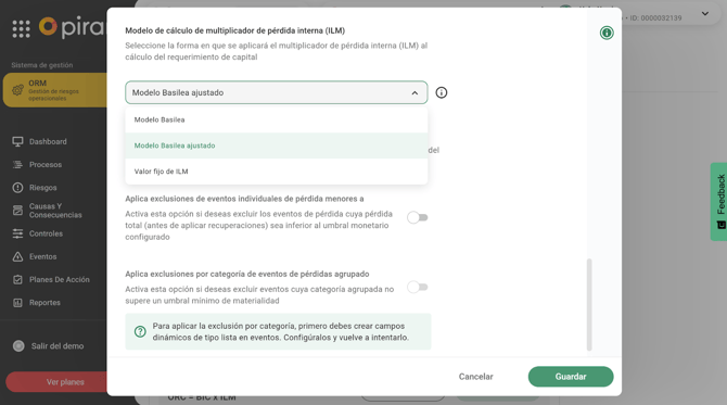 El Componente de Pérdida (LC) del SMA puede calcularse aplicando reglas de exclusión de eventos operativos, según se permita en la regulación local. Pirani permite configurar dos mecanismos de exclusión: