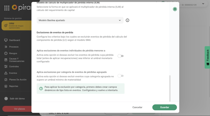 Esta funcionalidad permite excluir automáticamente los eventos individuales de pérdida operacional cuyo valor esté por debajo de un umbral mínimo de materialidad.