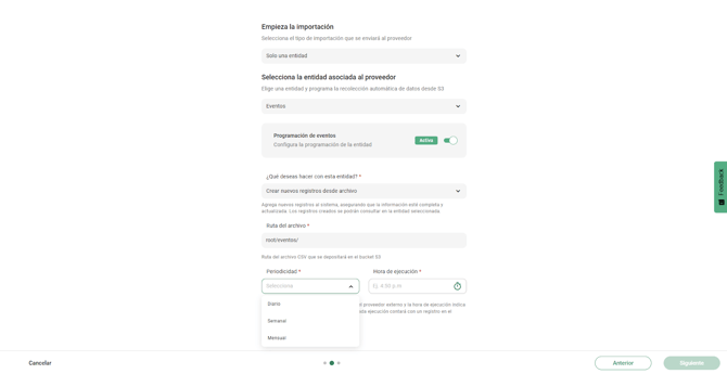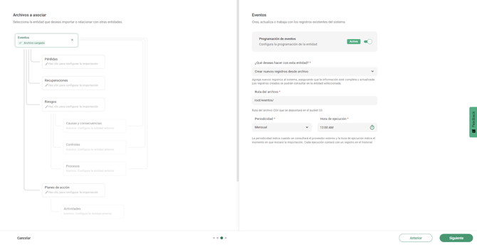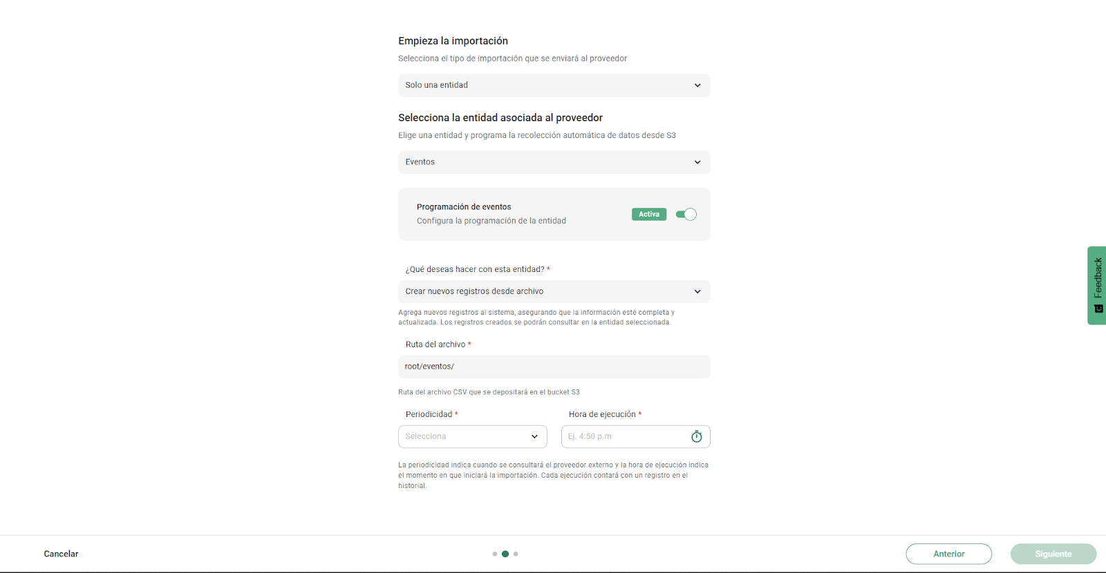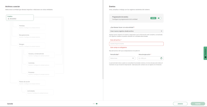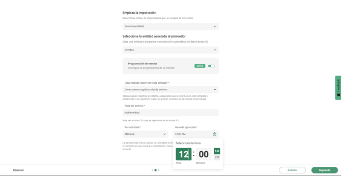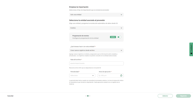 A diferencia de la carga masiva tradicional, donde se sube un archivo directamente en el sistema, la importación programada requiere indicar la ruta dentro del S3 donde el sistema buscará los archivos en cada ejecución. Esta es la carpeta que el equipo de tecnología creó para esa entidad (por ejemplo, /eventos).