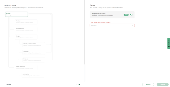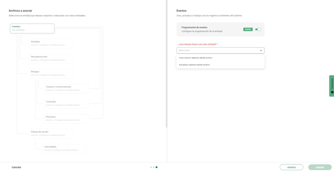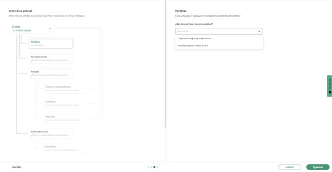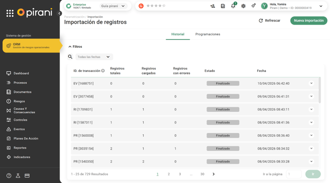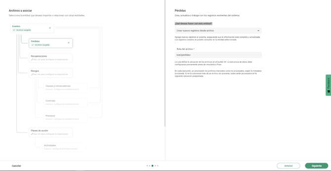 El sistema respeta la relación entre entidades y las procesa en orden. Por ejemplo, al cargar riesgos con eventos asociados: primero se crean los riesgos, luego los eventos y finalmente se realiza la asociación entre ambos. Todo ocurre automáticamente dentro de la programación.