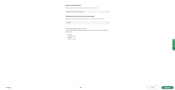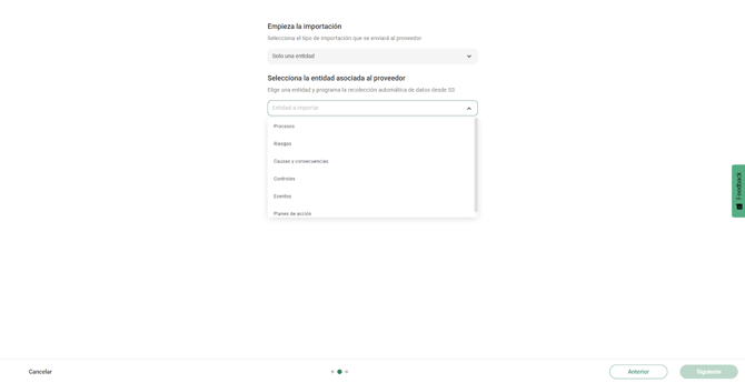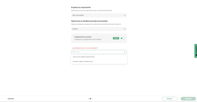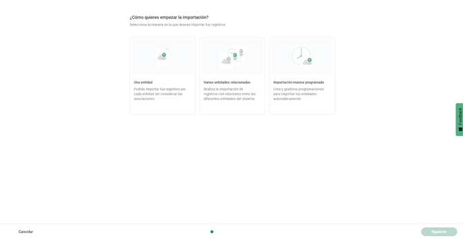Selecciona si vas a importar “Una entidad, “Varias entidades relacionadas” o “Importación masiva programada”