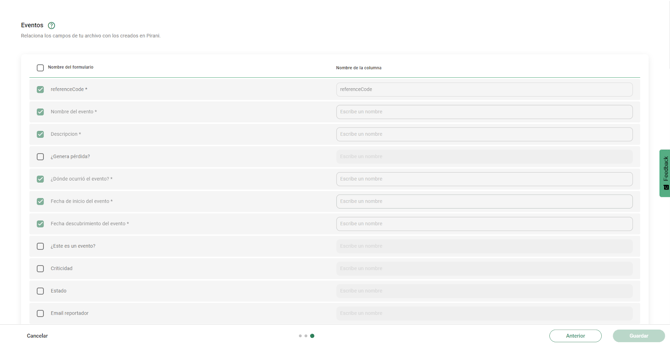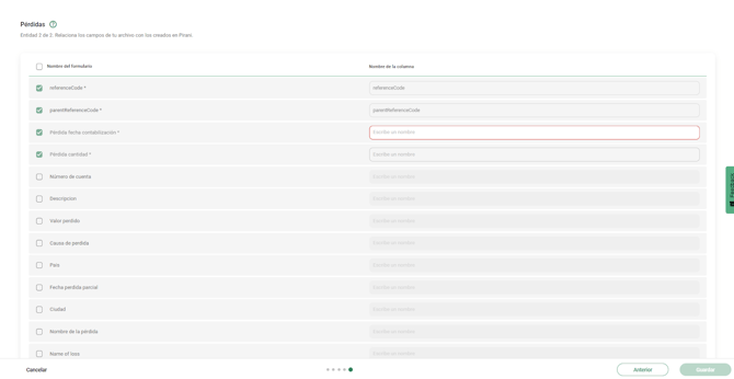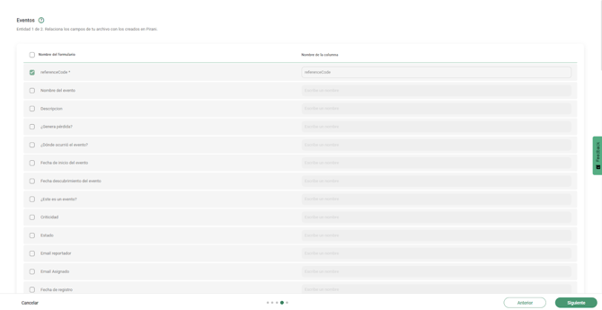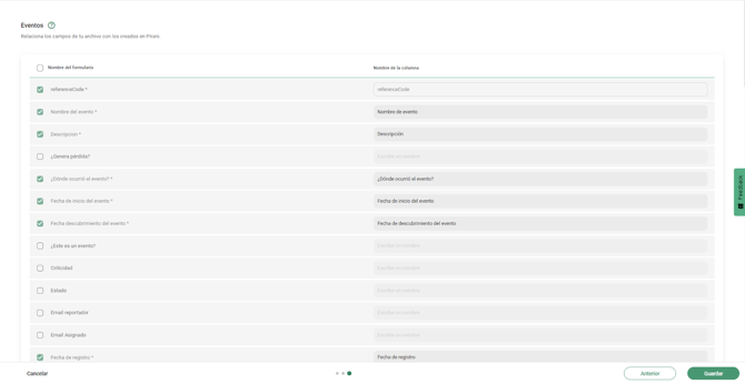 Respecto a los campos no obligatorios: aparecen deshabilitados por defecto. Si se desean incluir, pueden activarse manualmente asignándoles el nombre exacto de la columna correspondiente.