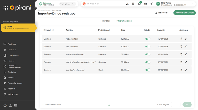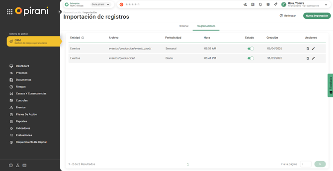 La programación define cuándo y con qué frecuencia el sistema ejecuta automáticamente la importación de datos. Cuando una programación está activa, el sistema realiza las ejecuciones en los horarios y periodicidades configuradas, sin necesidad de intervención manual. Si en algún momento no se requiere continuar con las cargas (por ejemplo, durante un periodo en el que no se generarán archivos), la programación puede desactivarse. Al desactivarla, deja de ejecutarse, pero no se elimina ni se pierde su configuración. Esto permite que, cuando se necesite nuevamente, simplemente se vuelva a activar y el sistema retome automáticamente las ejecuciones según la configuración definida.