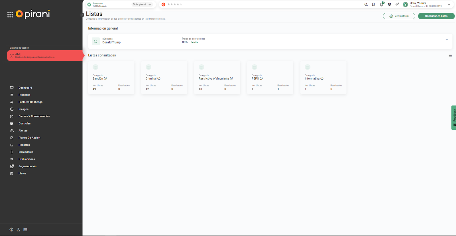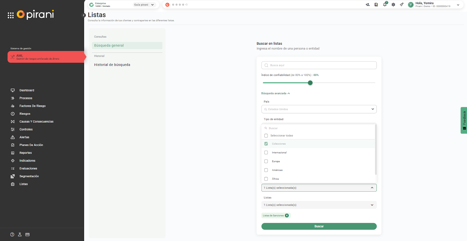 En Pirani, la sección de Listas permite realizar una debida diligencia más completa, facilitando el conocimiento de clientes, contrapartes y usuarios a nivel internacional a través de la integración con listas de Sanctions, y ayudando a identificar si una persona o entidad representa un riesgo o requiere un tratamiento diferenciado.