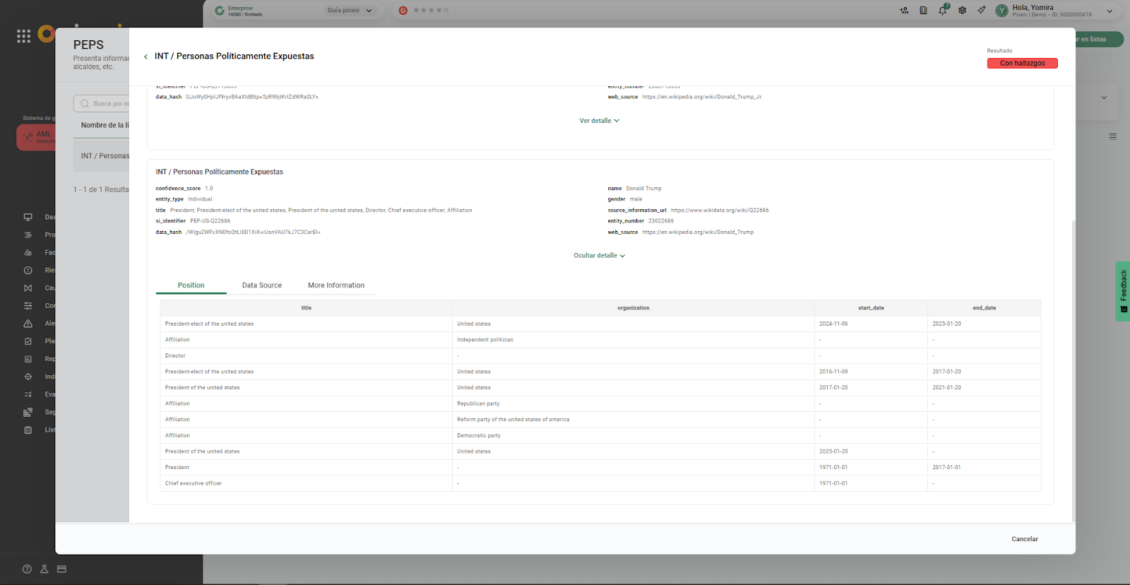 Nota: Las listas PEPS suelen ser solo de referencia, mientras que criminales y jurisdicciones de alto riesgo generalmente tienen connotación negativa.