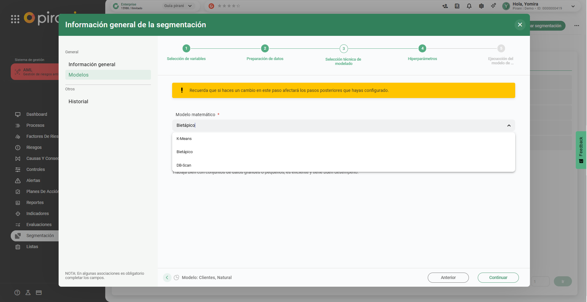 Paso 3. Selección técnicas de modelado: Después de completar el proceso de preparación de datos, debes elegir una técnica de modelado. Las opciones disponibles son K-Means, Bietápico y DBSCAN. Cada una se describe a continuación: