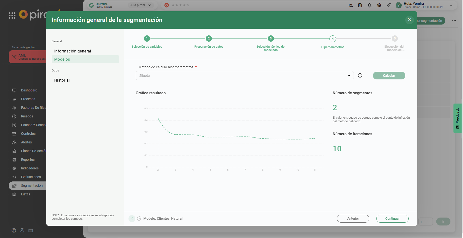 Paso 1. Selección de variables: En este paso debes seleccionar las variables con las que vas a segmentar los datos del conjunto, las variables que vas a encontrar para elegir son aquellas que se encuentran en el formulario del factor de riesgos que estemos trabajando, en esta caso la de clientes. Es importante tener en cuenta que en esta paso solo podrás encontrar las variables de tipo selección única, compuesta y numéricos.