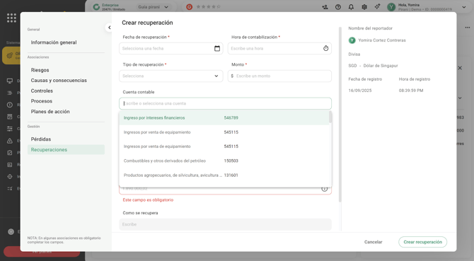 En pérdidas o recuperaciones puedes ver cómo asociar cuentas contables creadas en el módulo de parametrización.
