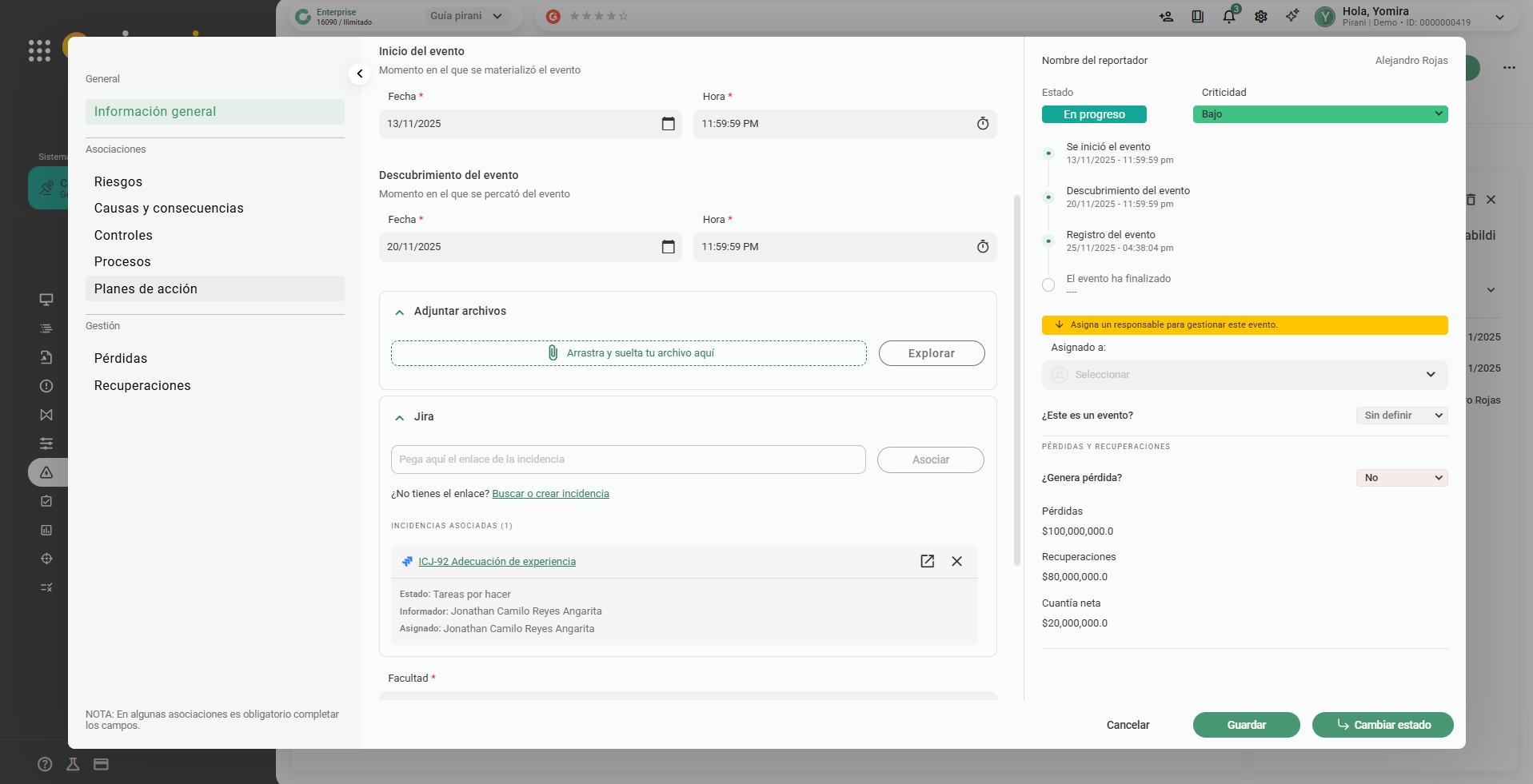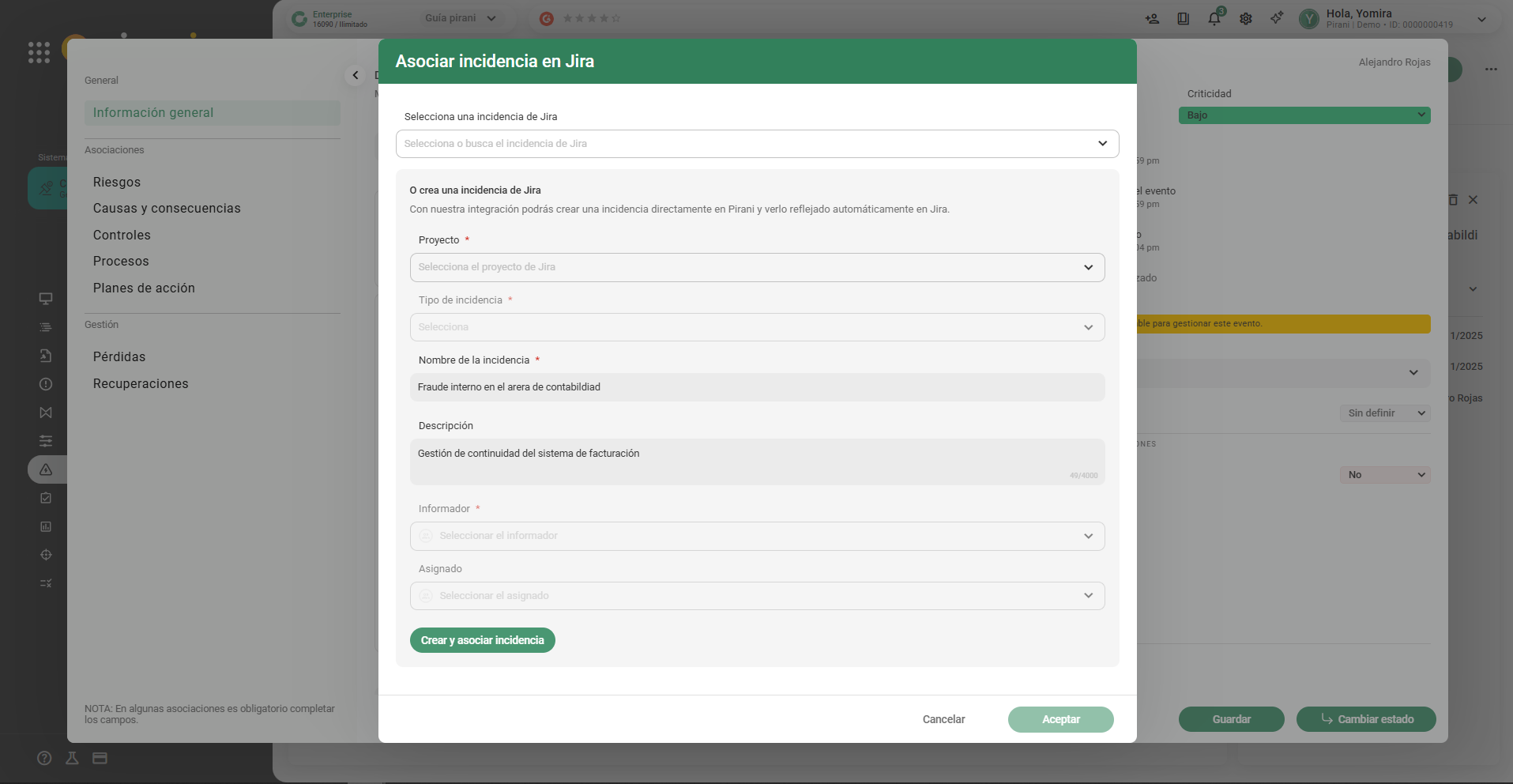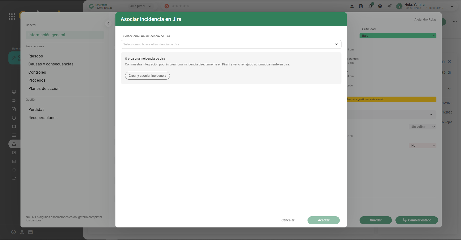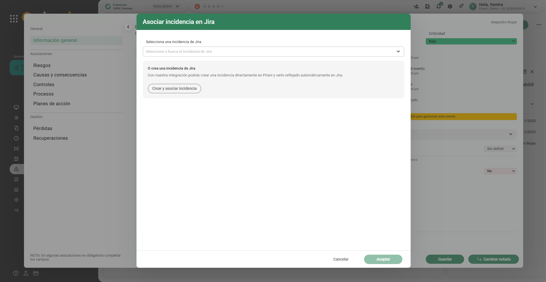Una vez completada la integración, podrás consultar y vincular información entre Pirani y Jira directamente desde el módulo de Eventos.