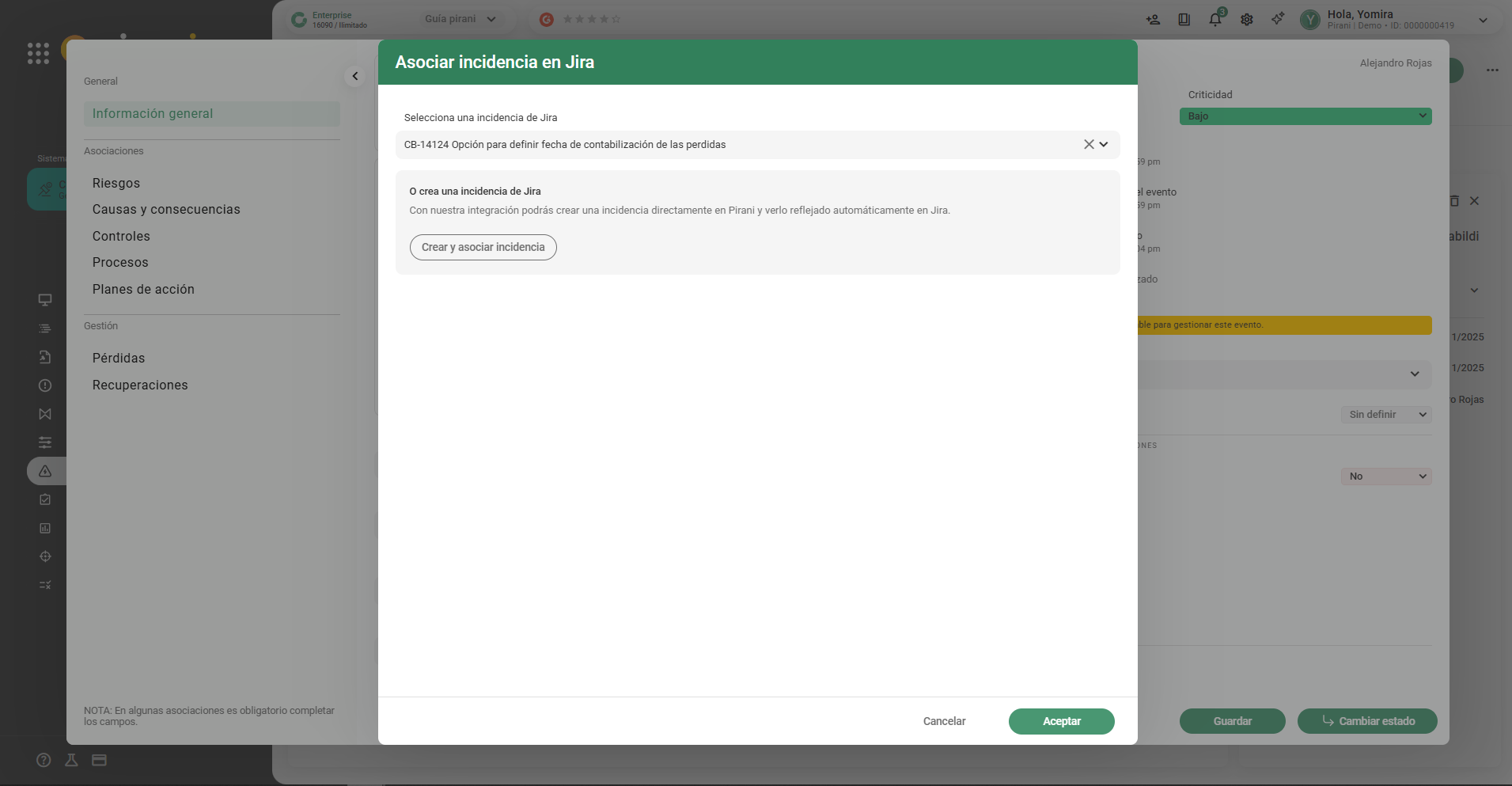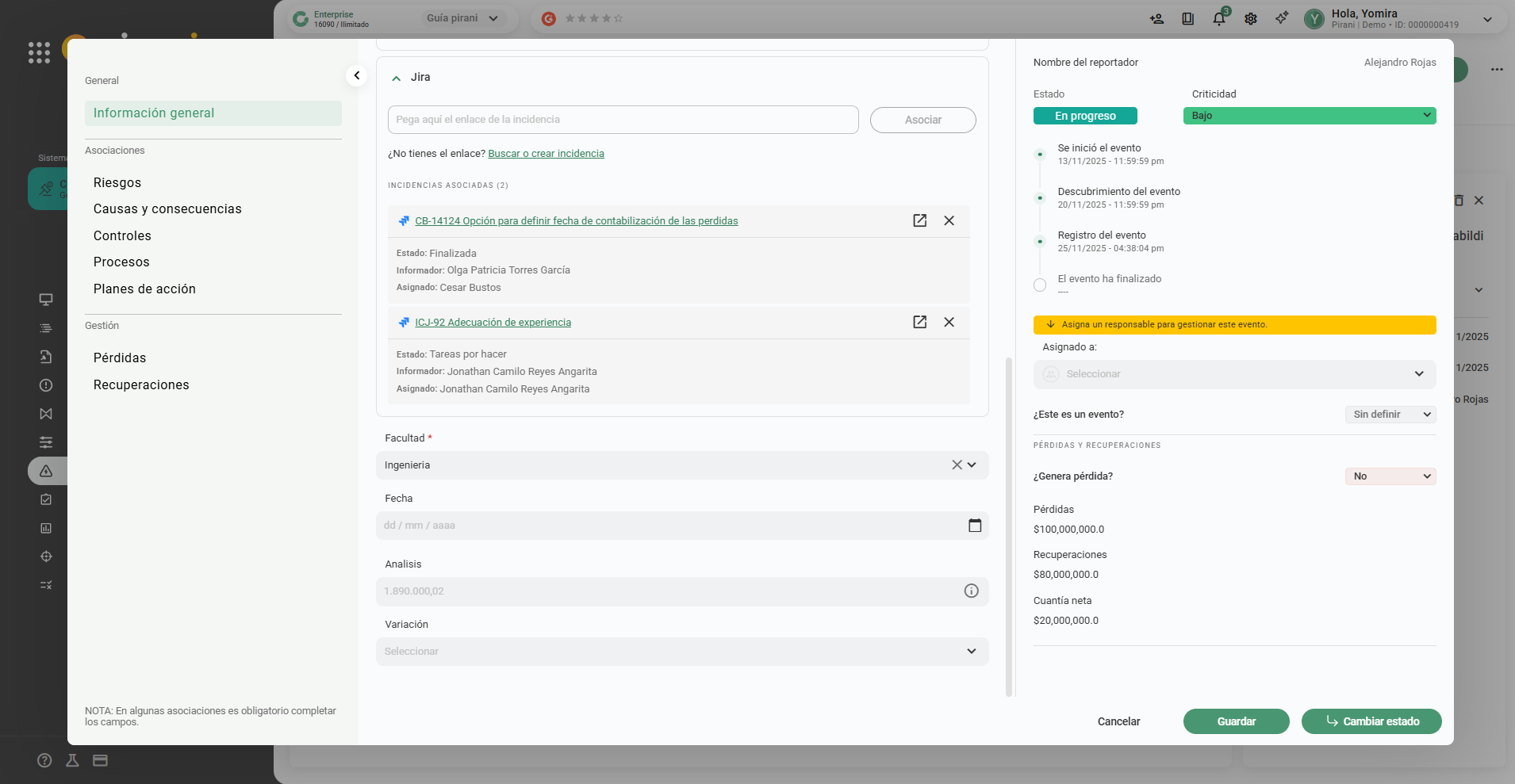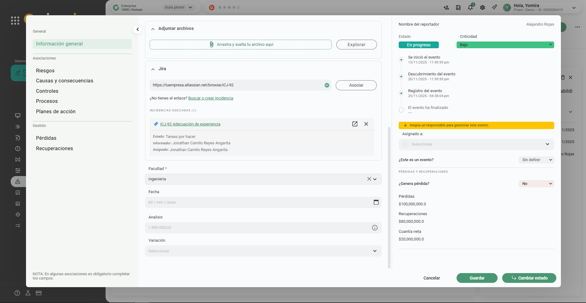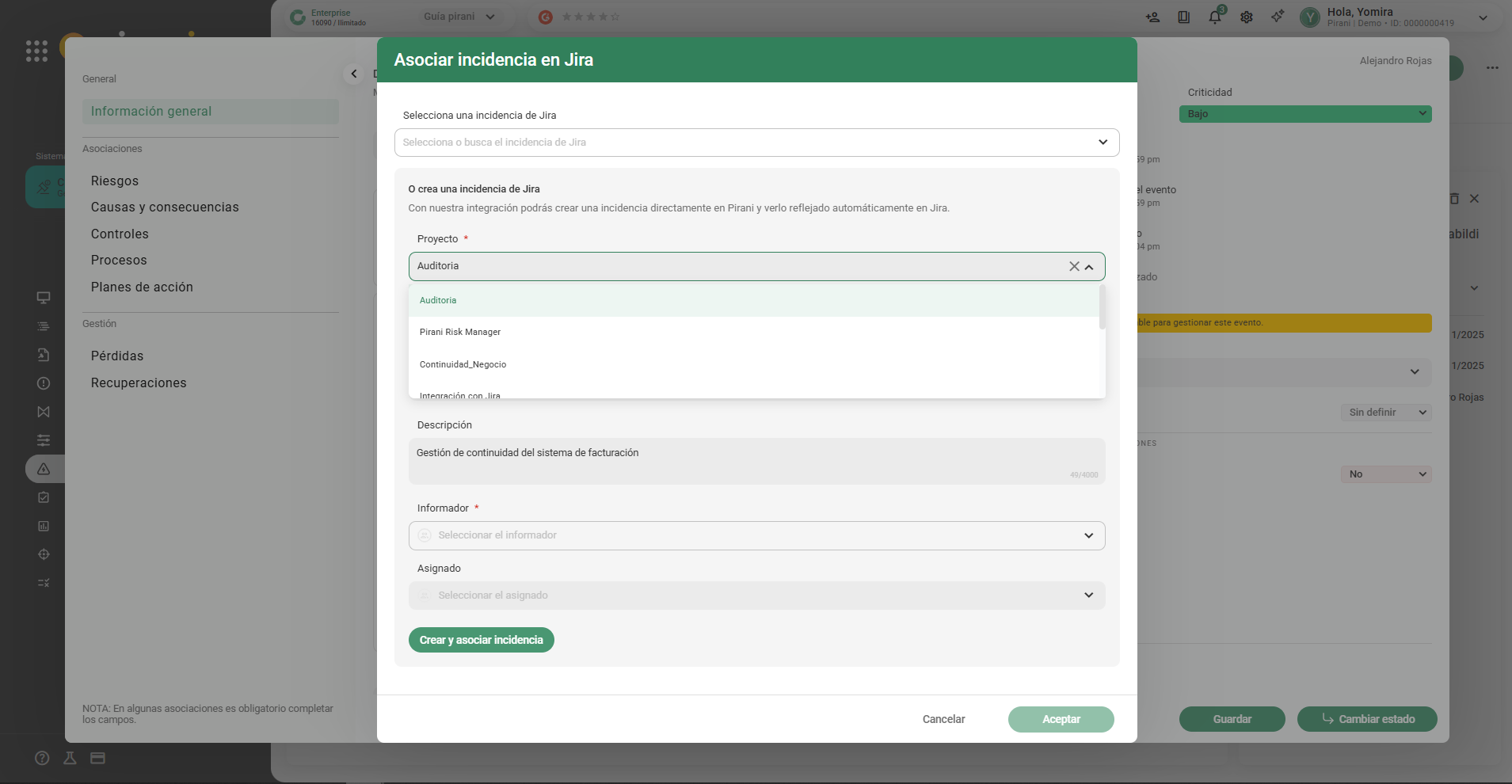 Una vez completada la integración, podrás consultar y vincular información entre Pirani y Jira directamente desde el módulo de Eventos.