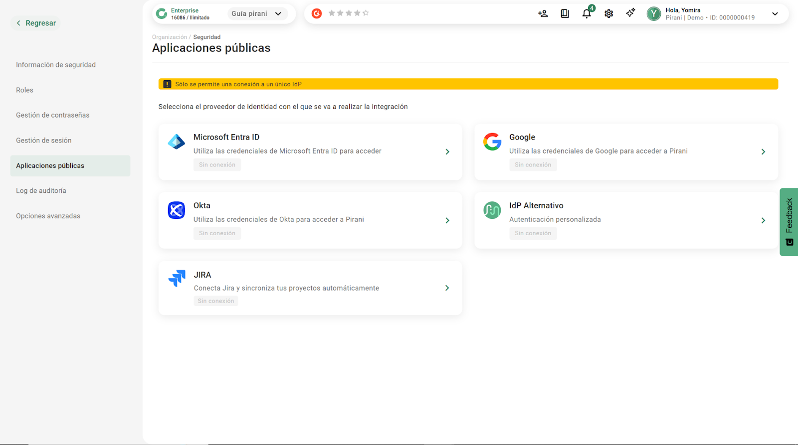 Ingresa a Administrar organización y selecciona la opción Seguridad.