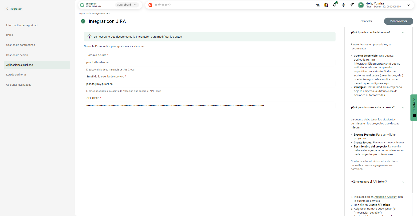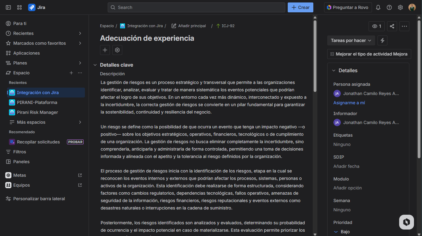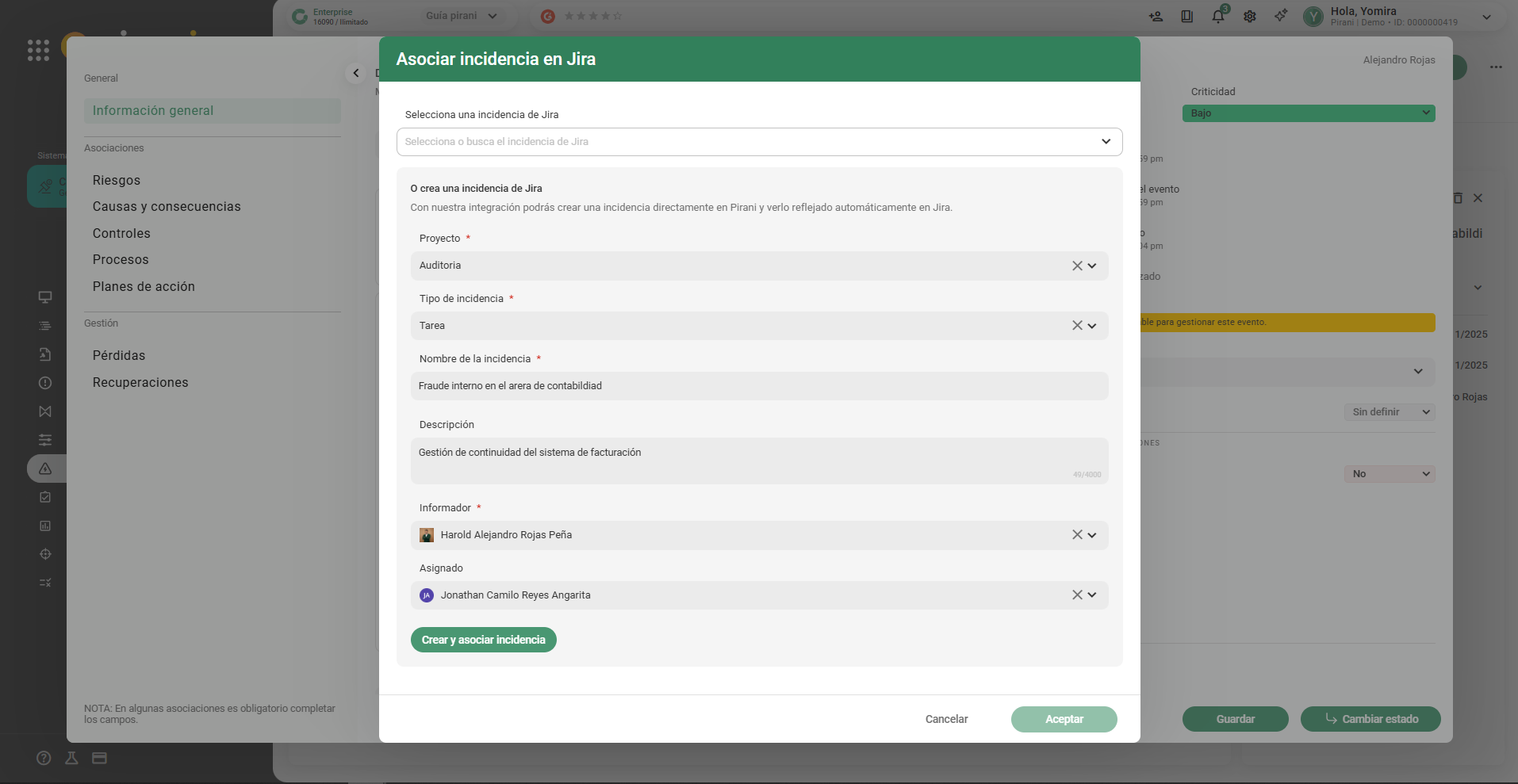 - La gestión de la incidencia se realiza completamente desde Jira, mientras Pirani mantiene el registro vinculado al evento.