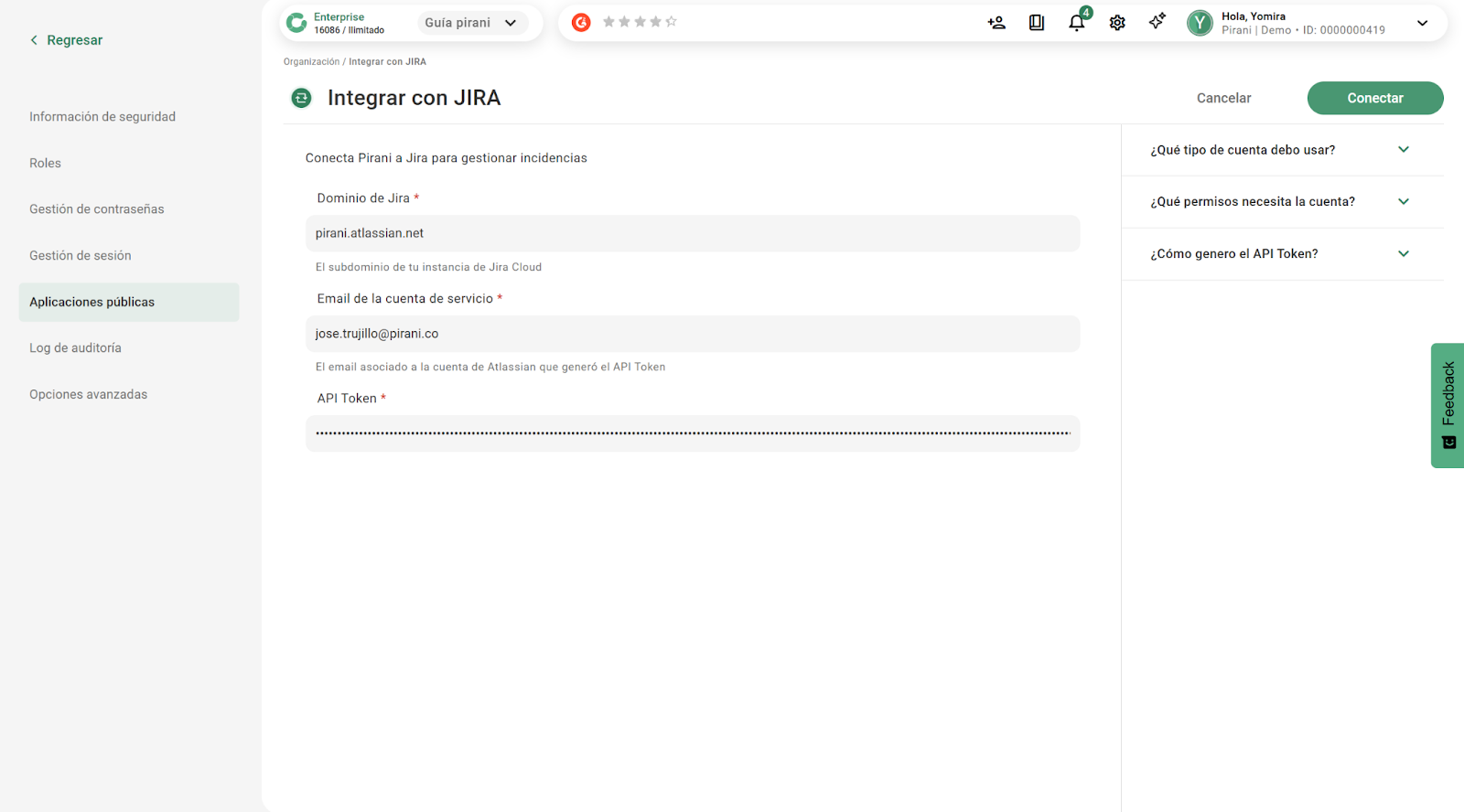 Debes generar este token desde Jira, en la sección “Aplicaciones de Jira”, donde crearás una conexión.