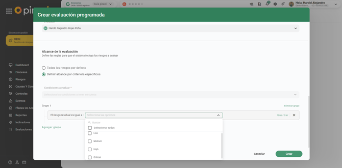 Si seleccionas la condición de que el riesgo residual es igual a una de las opciones que te aparecerán, esta establecerá las condiciones de una entidad determinada.