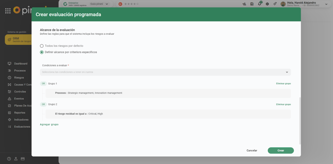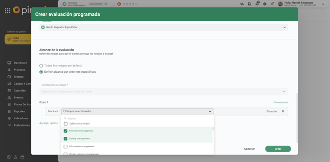 Si deseas crear un plan de evaluación solo con riesgos específicos, selecciona únicamente los procesos a los cuales están asociados esos riesgos y haz clic en “Guardar”.