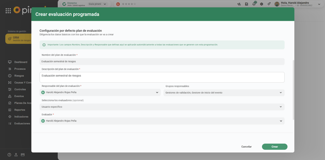 • Responsable del plan de evaluación: Usuario encargado del seguimiento del plan.